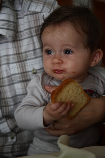 Julie découvre le pain et les biscottes avec bonheur!