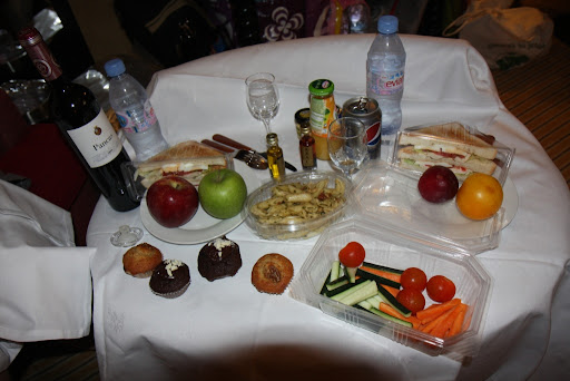 C'est la grande classe : vraie vaisselle, bouteille de vin, fruits et crudités avec sauces assorties...