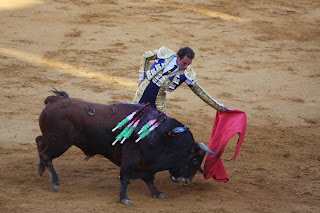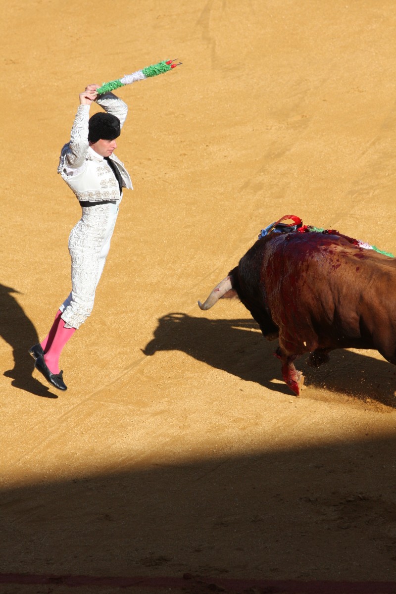 Le côté folklorique avec l'arrivée théâtrale des toréadors qui saluent lentement la foule et le jury, les banderilleros qui virevoltent pour planter leurs banderilles est plutôt agréable à voir. Et quand le taureau meurt rapidement suite au coup d'épée du matador le spectacle est correct et plutôt esthétique. On est même impressionné quand ils tournent le dos à la bête. Mais le gros problème c'est quand la mise à mort traîne en longueur et qu'il faut plusieurs tentatives pour tuer l'animal.