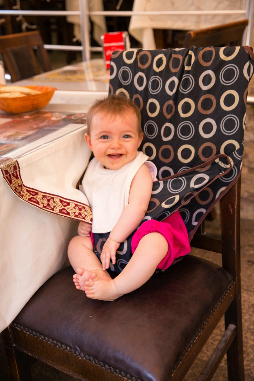 Pour Mathilde on a notre propre siège en tissu qui s'adapte sur tout type de chaise et qui surtout ne pèse pas grand chose