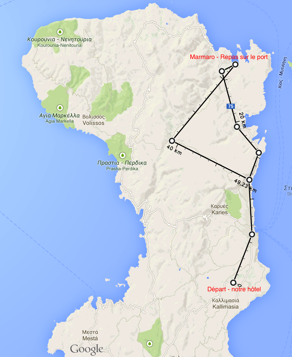 Nous partons visiter la ville de Chios - capitale de l'île éponyme - nous nous garons dans le centre mais en voyant que les filles dorment nous décidons de continuer notre chemin et nous partons au nord ouest de l'île. Voici le trajet de la journée: