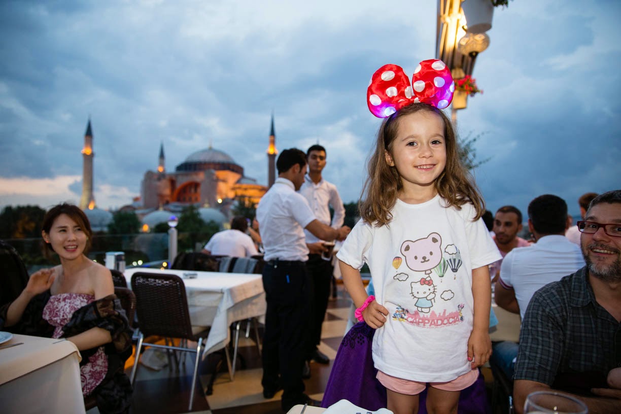 Le soir nous retournons sur la terrasse du tout premier restaurant où nous avions diné à notre arrivée à Istanbul il y a 3 semaines. La vue est exceptionnelle, la nourriture est très bonne et on passe un très bon moment. Julie va nous nouer un très bon contact avec les serveurs et jouer et discuter avec eux.