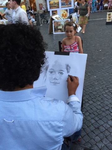 On retourne en soirée sur la place Navona. Il y a tous les soirs des spectacles de rue et c'est aussi là que se rassemble des artistes pour vendre leurs peintures ou dessins. On peut aussi se faire dessiner
