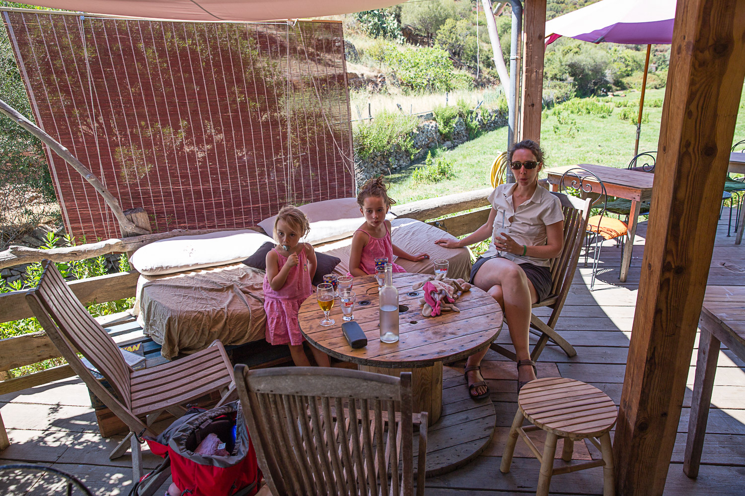 Au milieu de l'après-midi nous faisons halte à Girolata dans un petit havre de paix. Nous trouvons un petit bistrot tout ombragé, avec des canapés où nous faisons une pause avant le chemin du retour. C'était uen pause bienvenue car Céline avait demandé un sac au capitaine du bateau ...