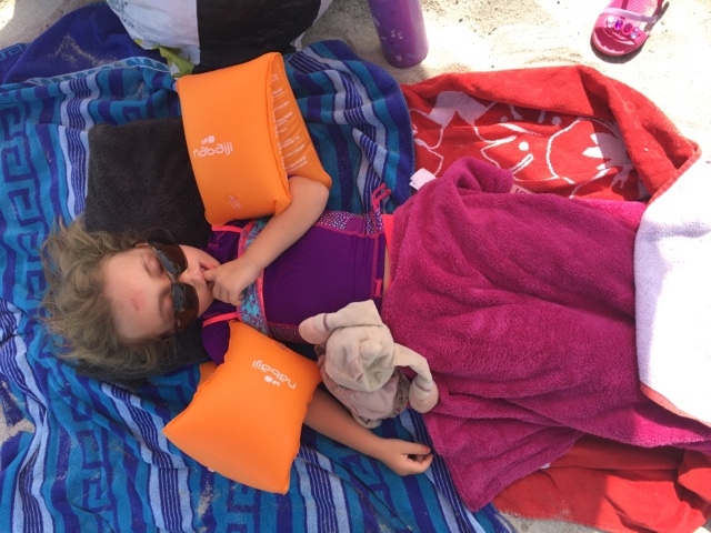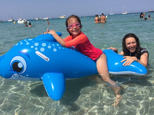 Mathilde fort sur la plage pendant que Julie profite de son dauphin