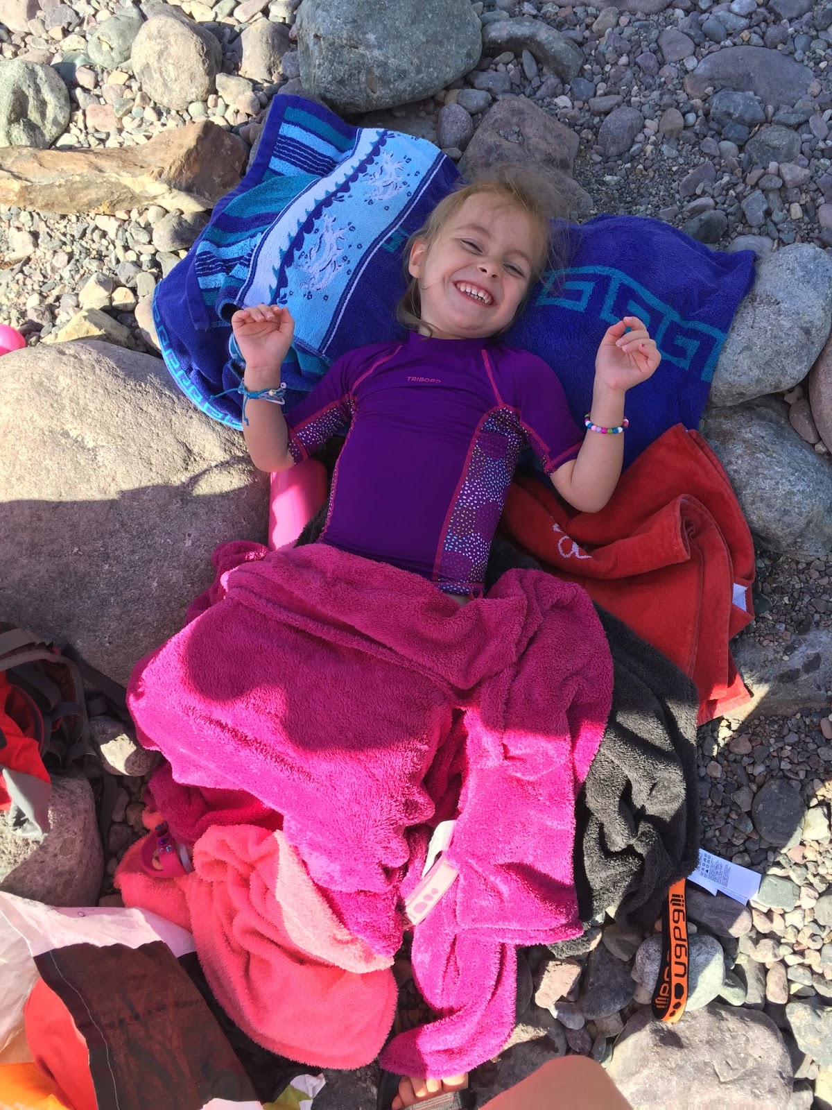 L'eau est magnifique, assez chaude, transparente. On fait tous des sauts dans la rivière même mathilde qui n'a peur de rien, et qui veut absolument faire comme sa soeur.