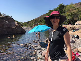 Nous partons après le repas vers une rivière à une demi-heure de route de Calvi. Mathilde s'endort dans la voiture, et je reste avec elle pendant que les deux autres filles vont se baigner. Après une bonne heure de sommeil on les rejoint au bord d'une rivière encaissée dans des falaises de rocher.