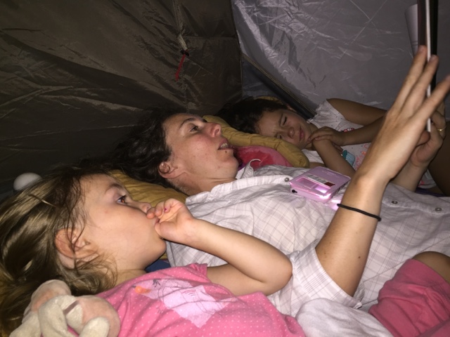 Après quelques bouchons du à une manifestation de corses qui protestent contre la fermeture d'une route à cause d'un risque important d'incendie, nous arrivons à notre camping. Il n'y a pas d'emplacements délimités c'est à chacun de trouver un coin de terrain et de s'y installer. Sauf que nous sommes arrivés tard et que le camping est presque plein. Nous voyons 3 emplacements libre mais en plein soleil. Nous finissons par planter notre tente entre 2 caravanes dans un bout de terrain étroit mais plutôt bien ombragé.