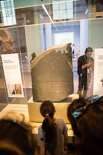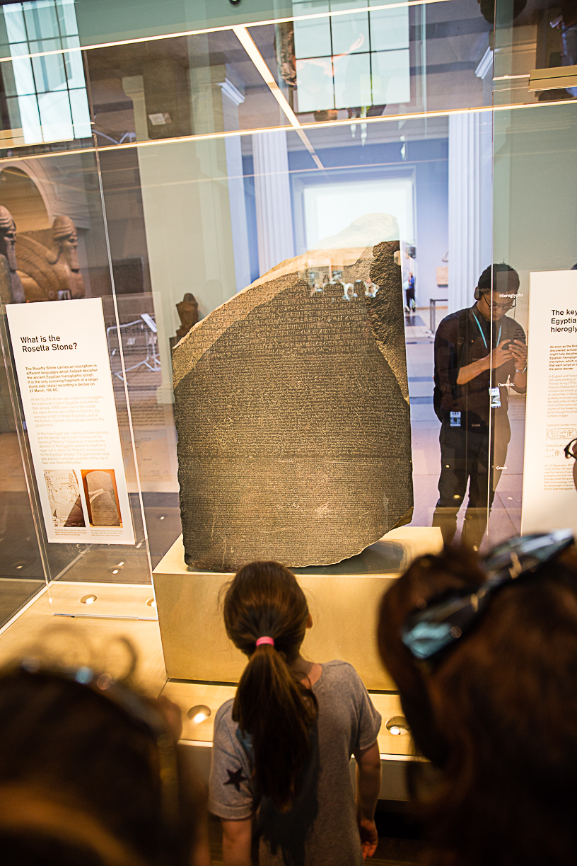 Ici la pièce la plus célèbre du musée : la pierre de Rosette ayant donné la clé pour déchiffrer les hiéroglyphes.