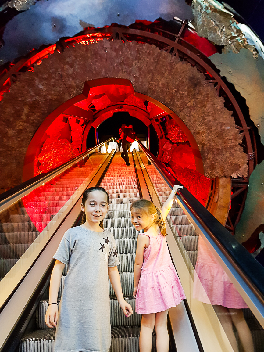 On commence par un spectaculaire escalator qui simule notre entrée vers les tréfonds de la terre,