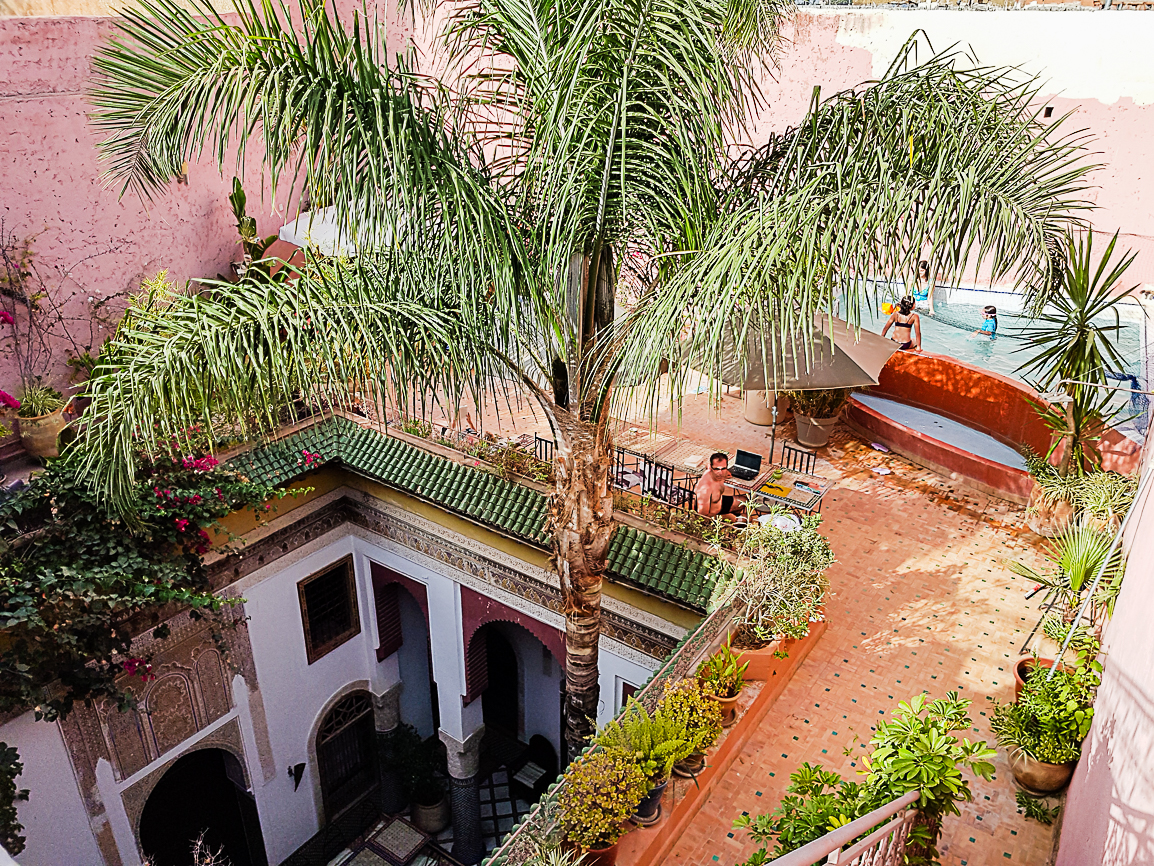 On rejoint notre riad qui a une piscine !!! C'est plutôt un petit bassin mais ça suffit au bonheur des filles qui jouent un bon moment avec les autres enfants du RIAD originaires de Marseille.