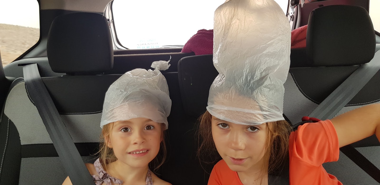 Julie ne se sent pas très bien eg nous demande un sachet. Au bout de quelques minutes Mathilde en veut forcément un et voilà comment ça finit.