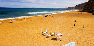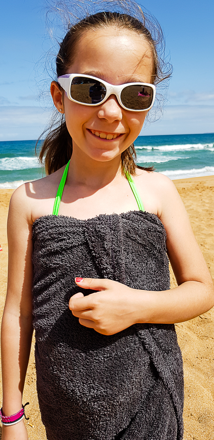 Il est 10h50 et nous sommes les premiers sur le parking. On loue un parasol et on s'installe. La mer est glacée ! Il y a des rouleaux impressionnants et un fort courant. On joue dans les vagues mais en restant bien au bord.
