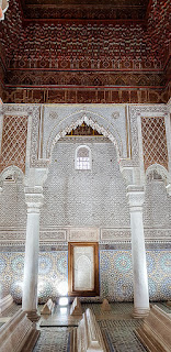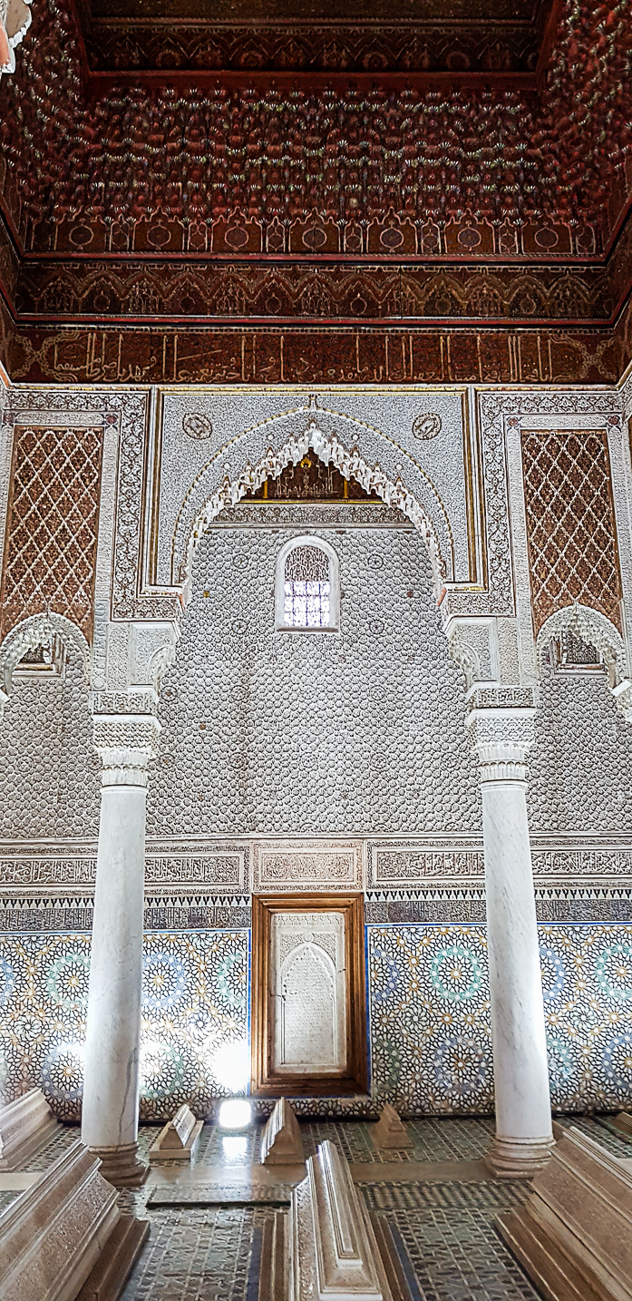 Nous partons ensuite visiter les tombeaux Saadiens. Tarif marocains 10 DH, étrangers 70DH, enfants gratuits. Cela change des autres villes où on payait toujours 10DH comme tout le monde. D'ailleurs sur le site, on est contrairement à toutes les autres villes précédentes entourés de touristes et on doit même faire la queue une dizaine de minutes pour voir la plus belle salle des tombeaux.