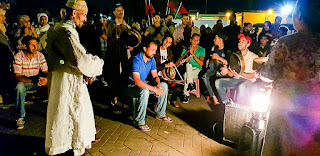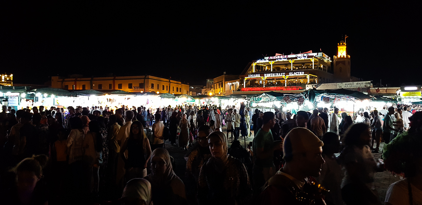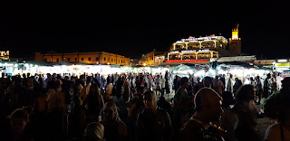 On mange dans un restaurant en terrasse et on voit la foule grossir sur la place au fur et à mesure que la soirée avance. Il y a des dizaines de spectacles de rue. Des gens se promènent avec des serpents ou des singes pour proposer de faire des photos. D'autres proposent une espèce de pêche à la ligne, des femmes proposent des tatouages de Hénné, des vendeurs proposent des ballons aux enfants et des dizaines de spectacles de musiques fourmillent aux quatre coins de la place. C'est chamaré, c'est pleins d'odeurs aussi, c'est bruyant, c'est dense.