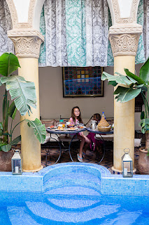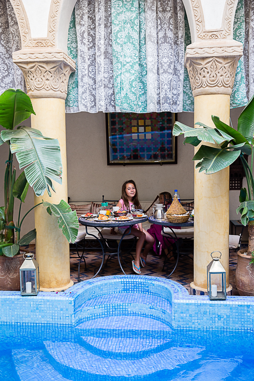 Nous prenons le petit déjeuner au bord de la piscine, et Mathilde est à l'eau avant 9h (il faut dire qu'elle s'est réveillée à 7h30 - Merci Céline d'avoir géré !).