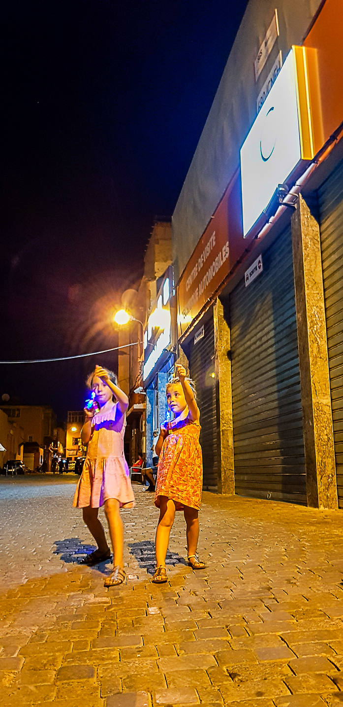 On ne s'attarde pas trop sur les différentes animations ce soir. On achète juste des lances hélicoptères (un élastique, une tige en plastique, et un engin lumineux avec 2 ailettes) qu'on s'entraine ensuite à lancer dans une impasse. Au bout d'une dizaine de minutes tout le monde arrive à faire de beaux lancés.