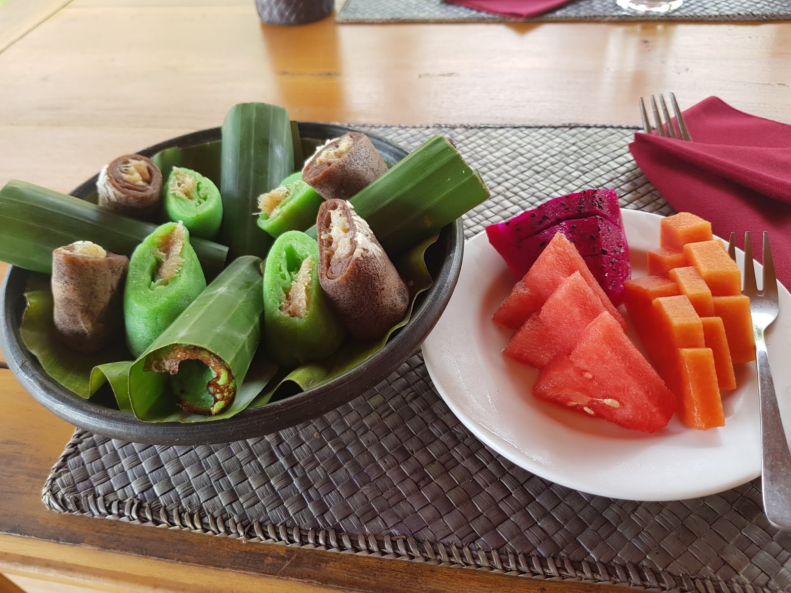 Après ces émotions nous repartons à l'hôtel et nous avons droit à un délicieux petit déjeuner, à base de fruits exotiques, d'omelettes, de toasts et de crêpes fourrées à la banane et au coco