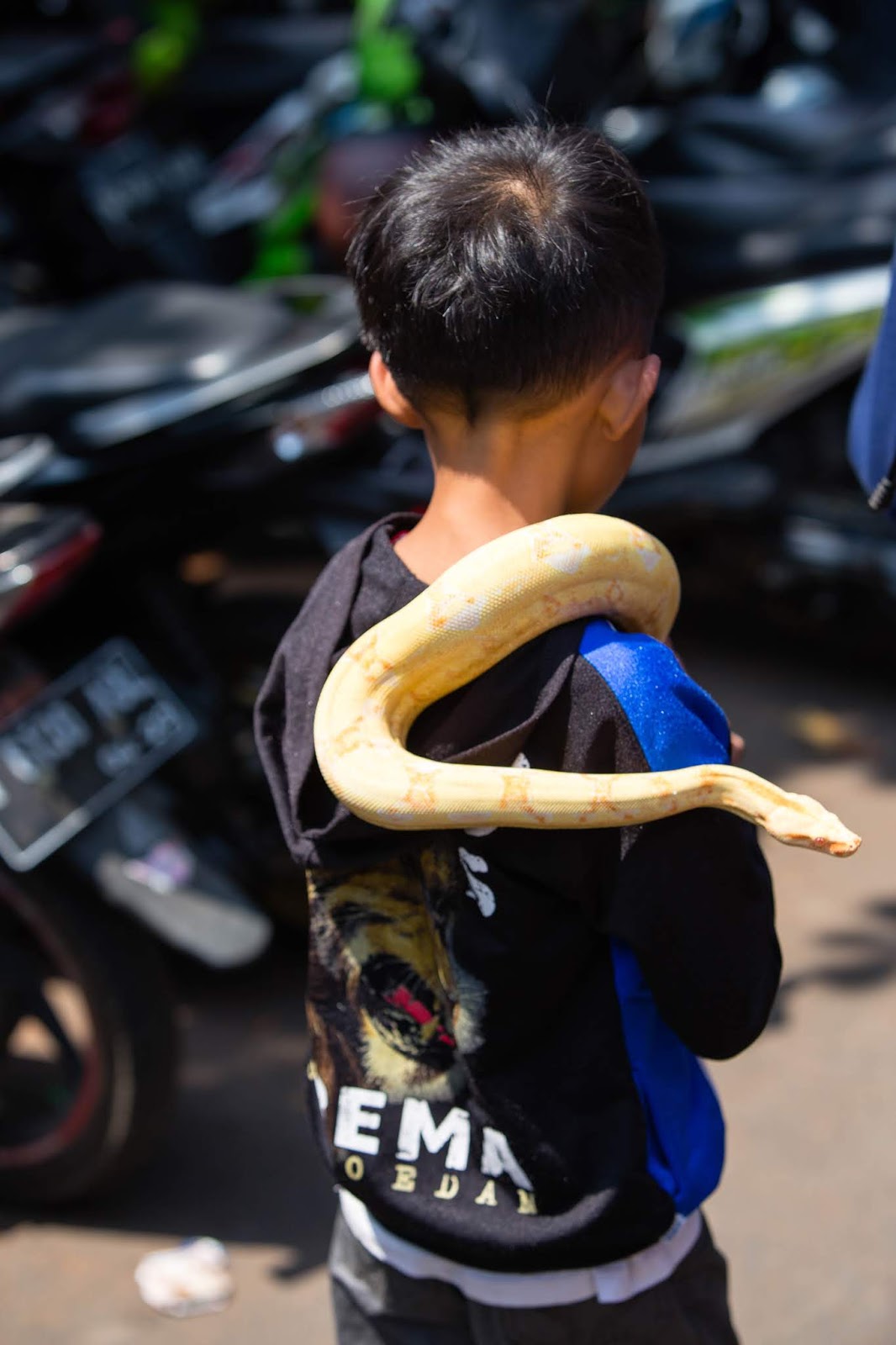 D'ailleurs notre première rencontre avec un serpent, c 'est Mathilde qui m'interpelle en me montrant un enfant et en me disant qu'il porte un serpent sur lui. Je lui réponds que c'est un jouet en plastique et elle me dit que non car il a sorti sa langue. On s'approche et effectivement ce jeune garçon se promène avec un gros serpent blanc et jaune sur lui.