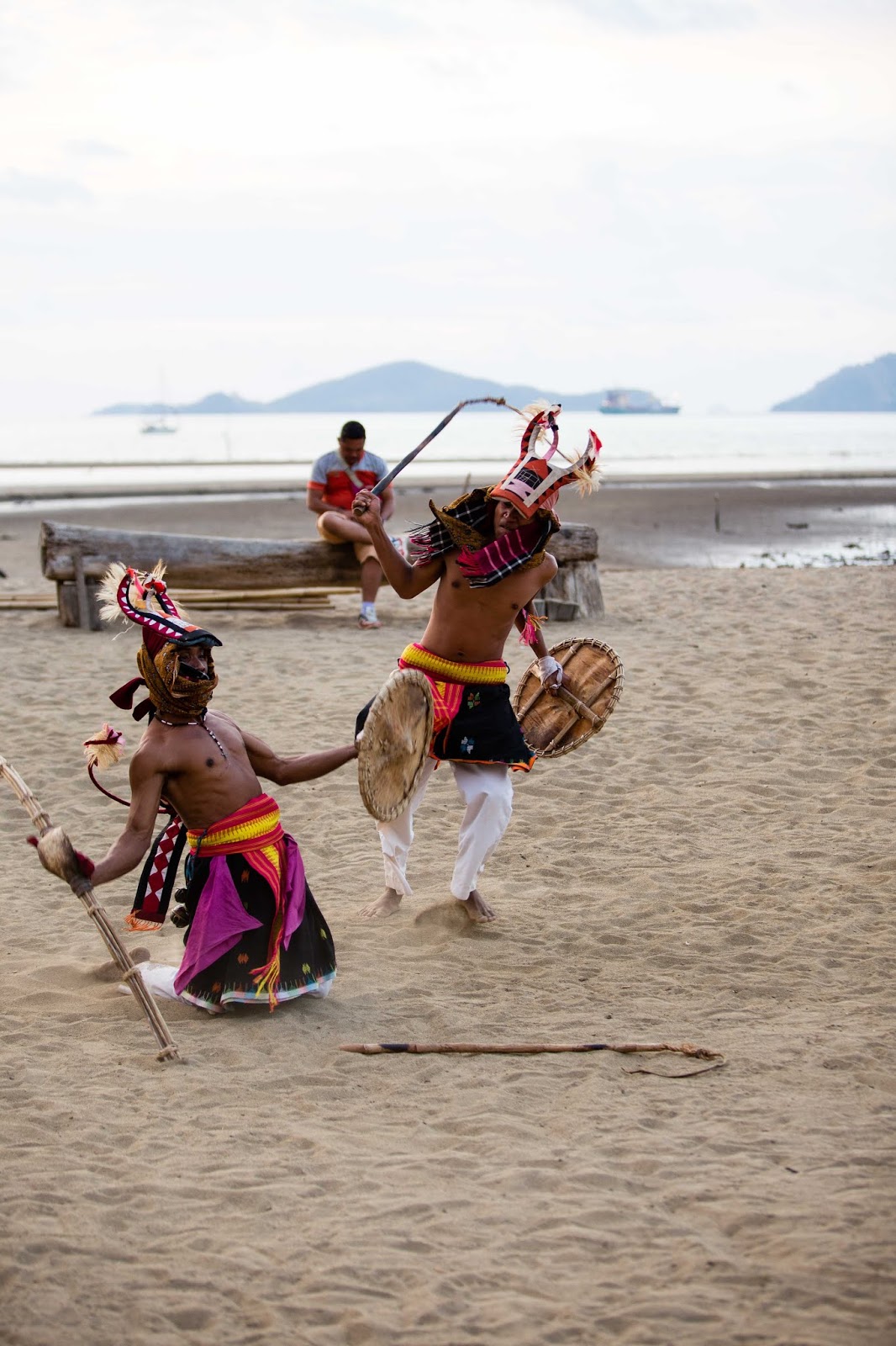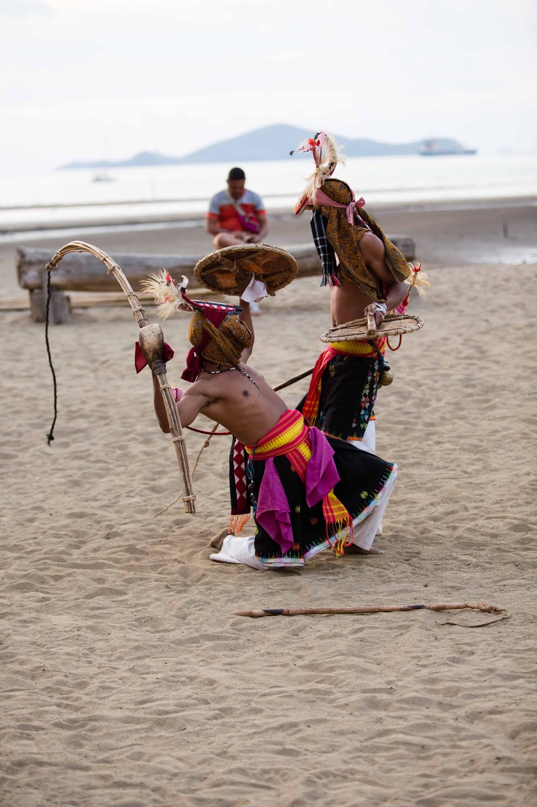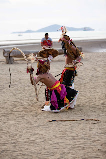 J'ai réservé un hôtel un peu à l'écart du centre ville mais avec la plage à 150 m. Après s'être installé, on file à la plage où on a l'excellente surprise de tomber sur un spectacle avec des musiciens, des gens habillés en costumes traditionnels et des photographes américains en train de filmer tout ça.