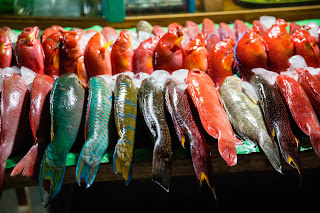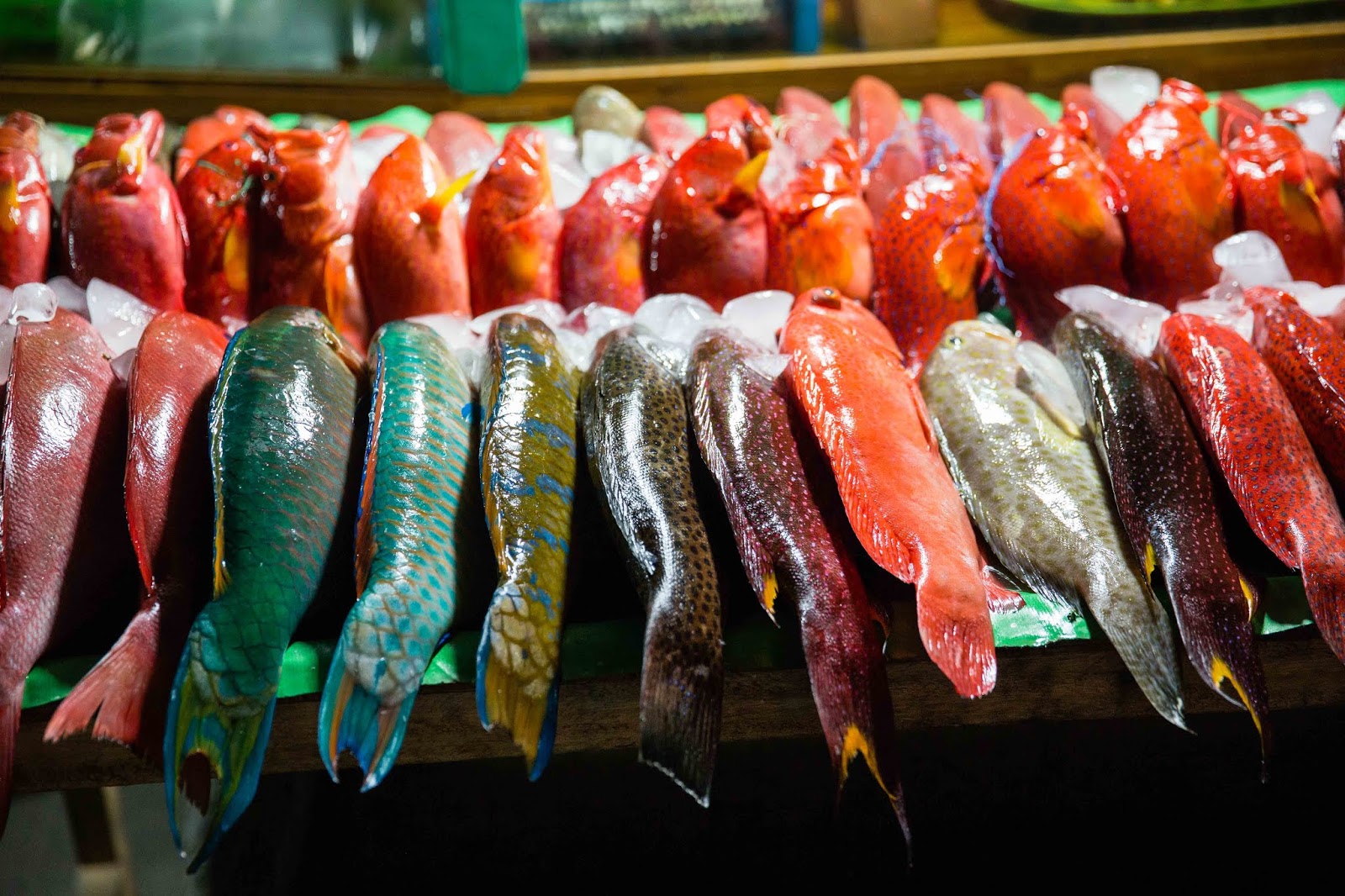 On dine sur le marché au poisson où on choisit des crevettes, des calamars, et un gros poisson rouge qu'ils vont griller pour nous au barbecue : le repas est top et tout le monde se régale !
