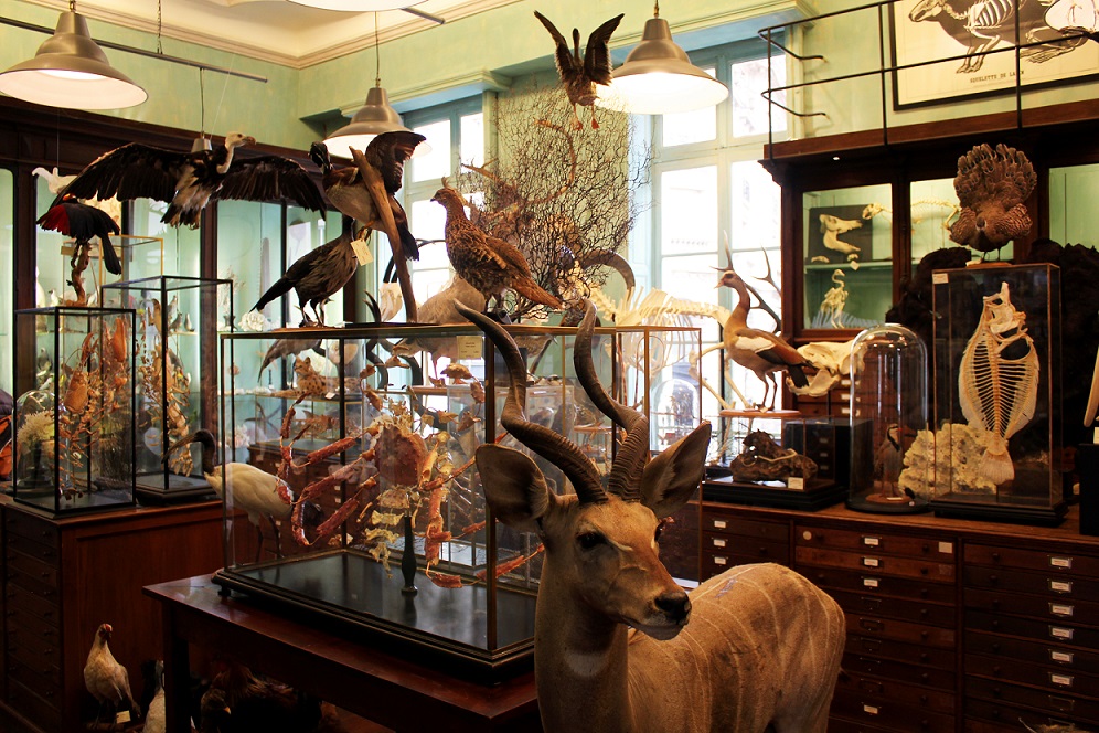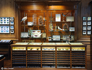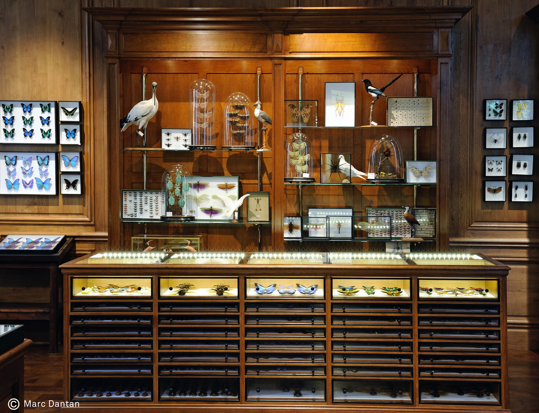 Pause dessin-animé l'après-midi, et on repart en soirée pour voir la Samaritaine. Au passage on s'arrête dans notre rue à la boutique Deyrolle. Et c'est un coup de coeur. Il s'agit d'une maison fondée en 1846 par la famille Deyrolle. Naturalistes de père en fils, ils ont fournis les écoles de la république en affiches pour les sciences naturelles. Ils présentent les classifications des animaux, des plantes, des insectes. Mais Deyrolle un département de minéralogie, un atelier d'ébénisterie et une boutique historique rue du bac qui présente sous la forme d'un extraordinaire cabinet de curiosités. Dans une ambiance digne d'une scène du siècle précédent, on retrouve des rayonnages d'insectes épinglés et classifiés, des coquillages, des crustacés éclatés et surtout de superbes animaux empaillés au réalisme surprenant.
