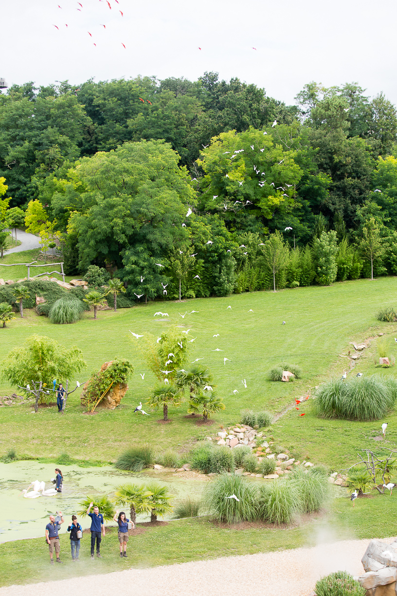 Après un premier tour on va à l'animation « Les maîtres des airs » qui est un spectacle d'oiseaux. Pour ceux qui ont été au Puy du fou c'est très semblable. Nous sommes assis dans des gradins, et les fauconniers circulent parmi les spectateurs attirant les animaux avec de la nourriture. Les oiseaux passent très près de nous et on en voit même un qui s'accroche à l'épaule d'un spectateur. On voit des hiboux, des perroquets, des charognards, des aigles, des faucons ...