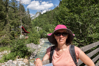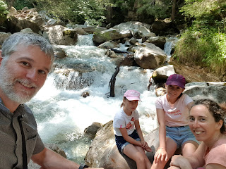 L'après-midi on part en balade, il y a des chemins de randonnées qui longent notre camping. On grimpe doucement à flanc de montagne au milieu des sapins. On rejoint ensuite le torrent où les filles s'amusent à lancer des galets et des bouts de bois.