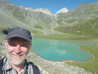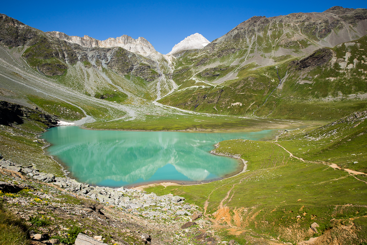 Le lac est très beau avec sa couleur turquoise. J'aperçois deux bouquetins dévalés la pente opposée et disparaître. Il n'y a personne et je vais me tremper les pieds. Le sol est très doux, comme du sable ou de la vase. La température de l'eau est comme attendu fraîche.