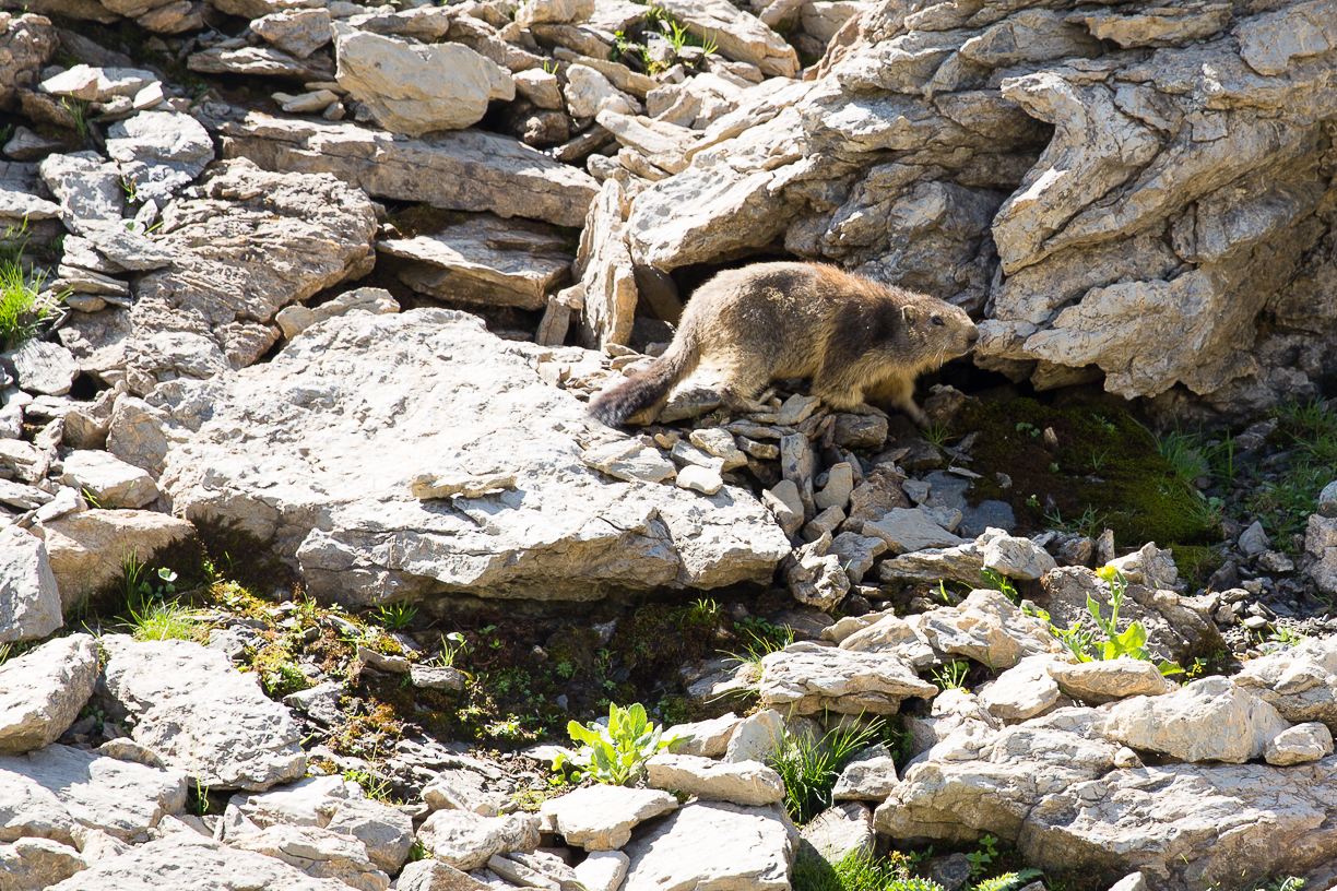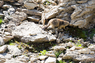 Je pique-nique au bord du lac, et commence le chemin retour vers 11h30. Alors que je remonte au dessus du lac, une marmotte traverse devant moi, suivi d'une autre. Elles ne sont pas très farouches et je peux faire quelques photos avant qu'elles ne partent.