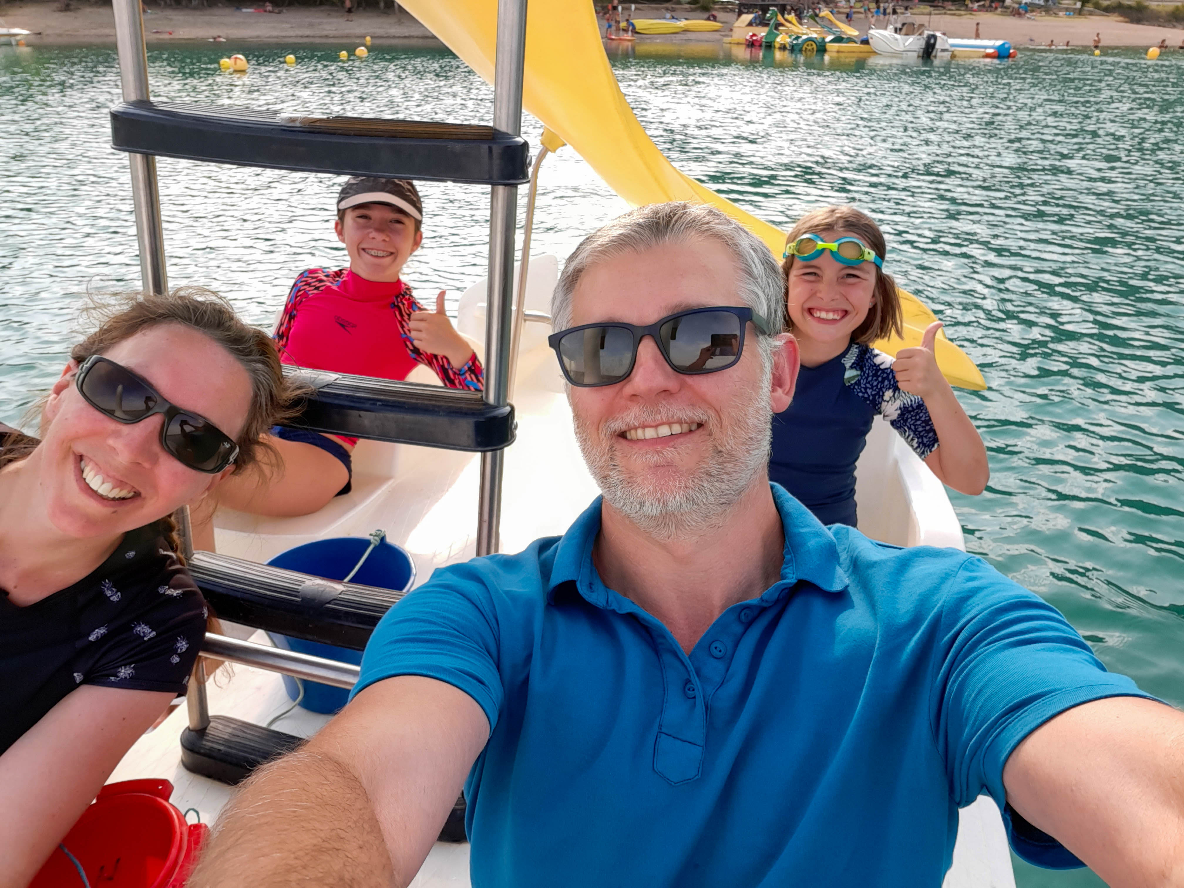 Puis on retourne au lac, et on loue des pédalos. Mais pas des pédalos basiques. On a un pédalo Cygne avec toboggan ! Les filles adooooorent.