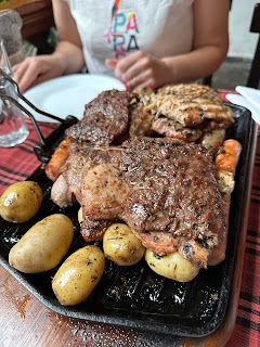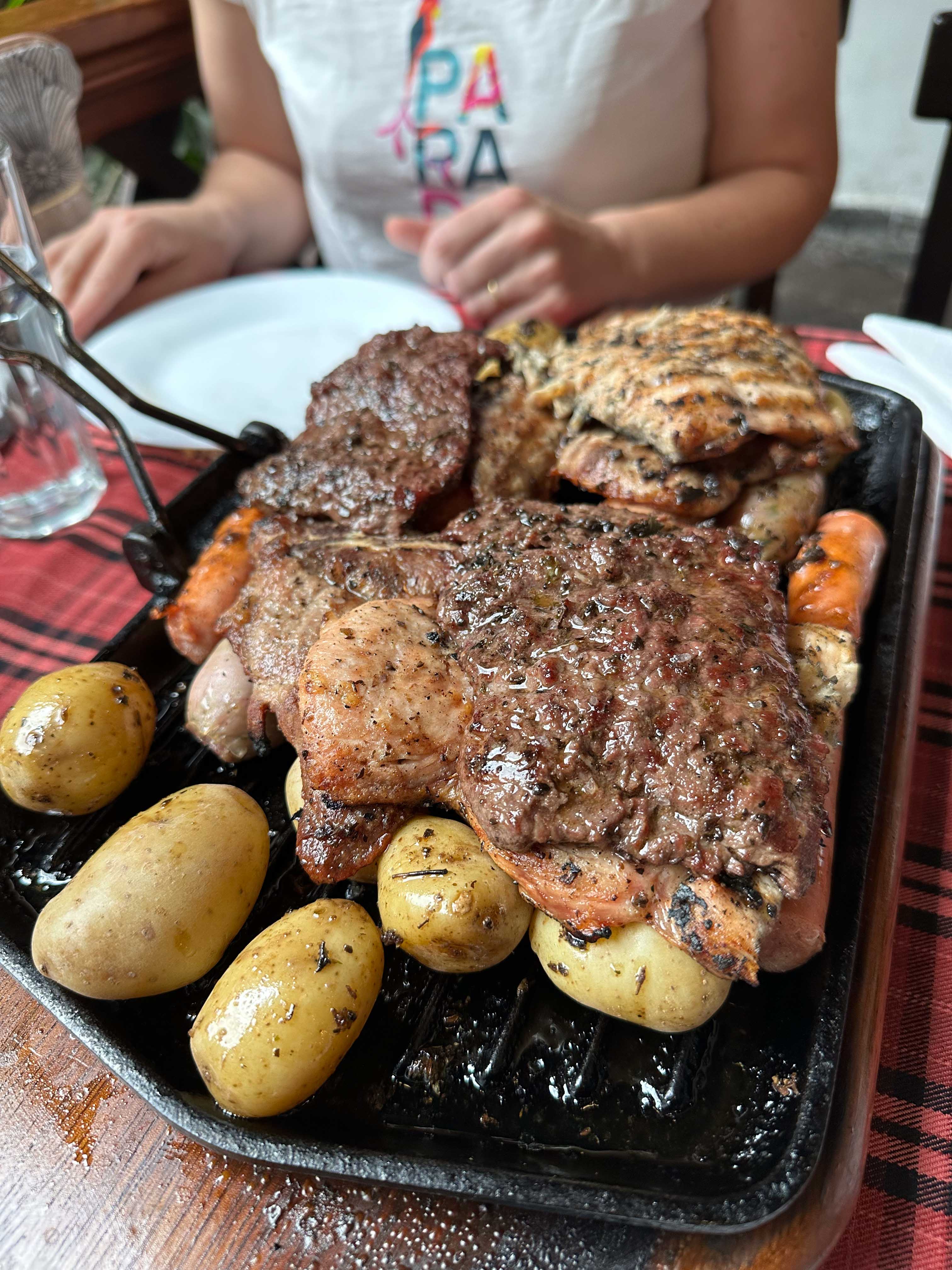 énorme plat de viande grillée, un hamburger pour Mathilde et des pâtes