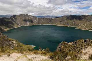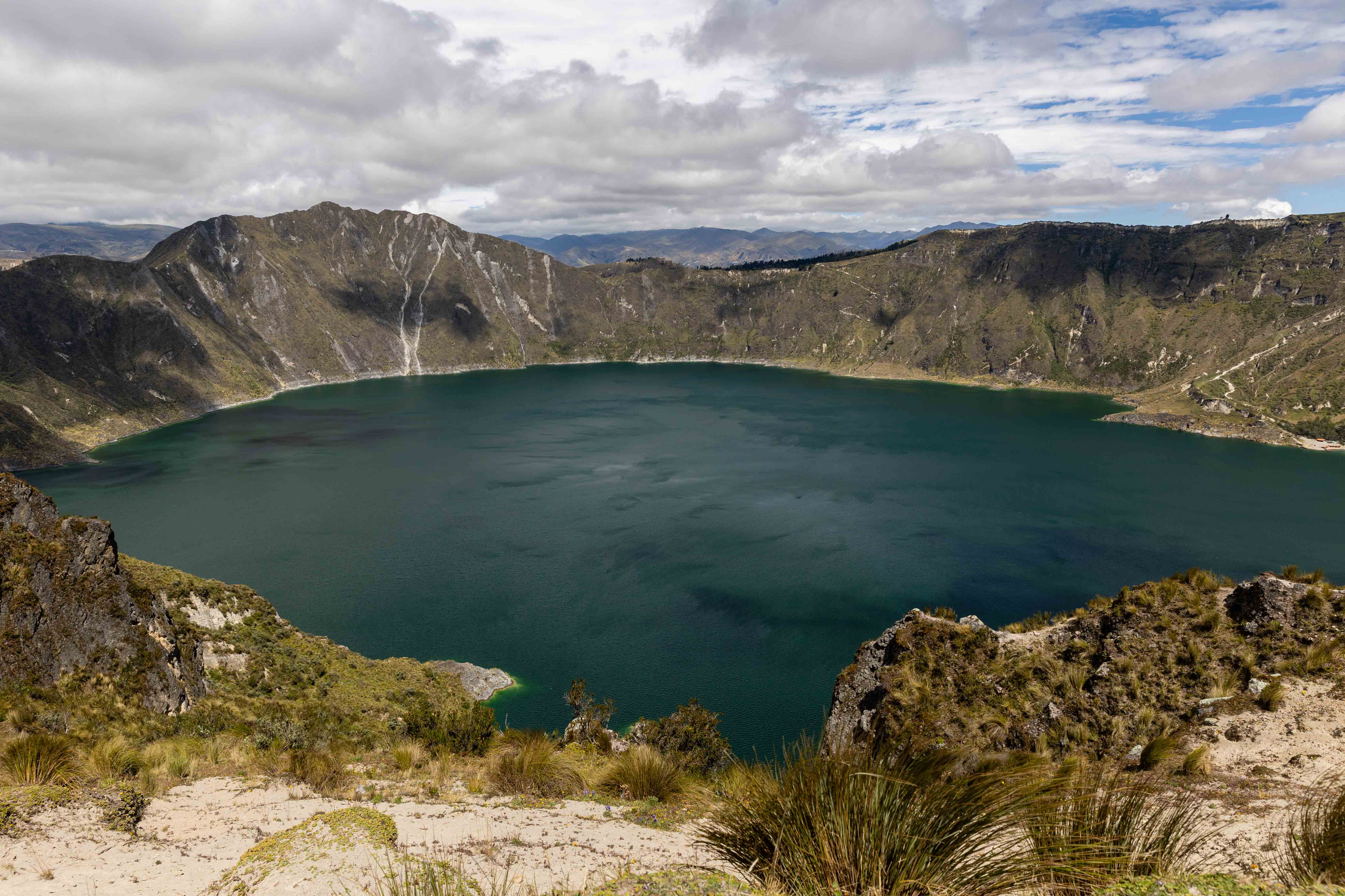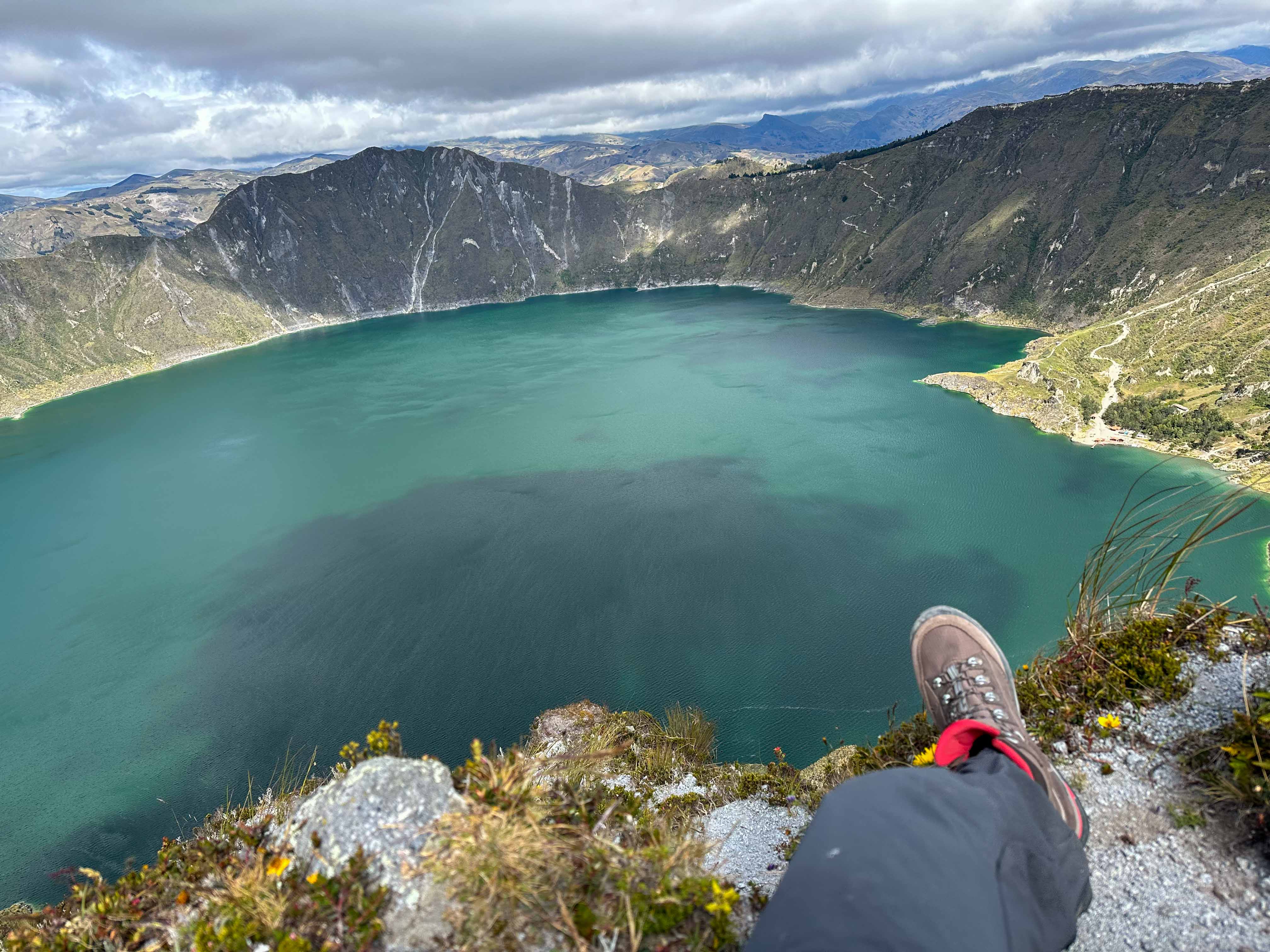 Enfin à 14h on arrive au sommet. C’est la tempête là-haut. Le vent doit souffler à cent kilomètres par heure. On a du mal à rester debout quand on se prend des bourrasques. On s’approche du bord et on le voit enfin. La Laguna de Quilotoa. C’est un magnifique lac enfoncé dans un écrin de falaise.