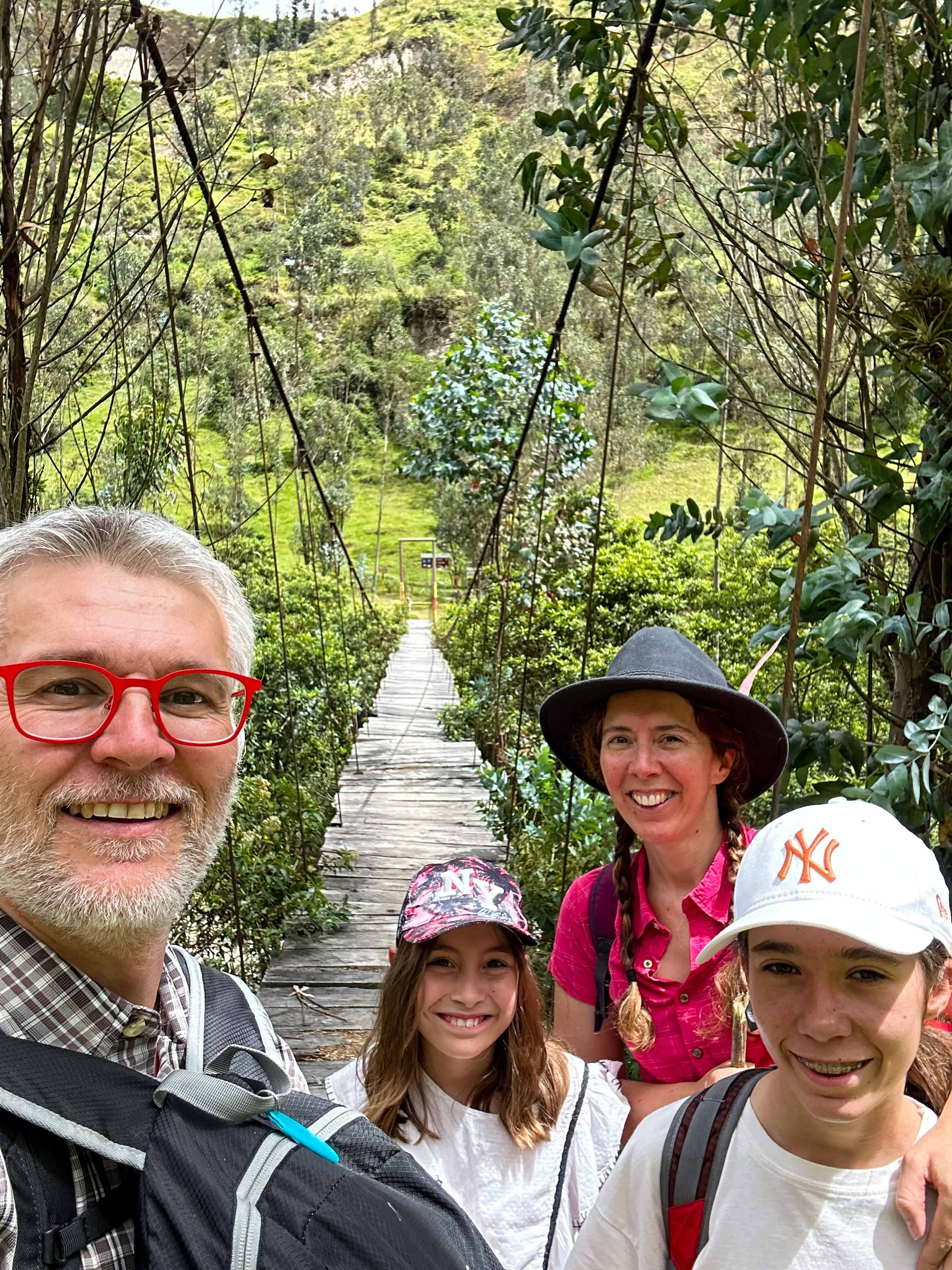 Mathilde et moi traversons les premiers. Elle devant et moi qui lui tient la main et qui essaie de me tenir aux câbles quand il sont à ma hauteur. Le pont n’est pas stable, ça bouge et on essaie de marcher au maximum au centre des planches. Mathilde est détendue et n’a aucun problème pour franchir la vingtaine de mètres au-dessus du vide. Je suis plus tendu qu’elle.