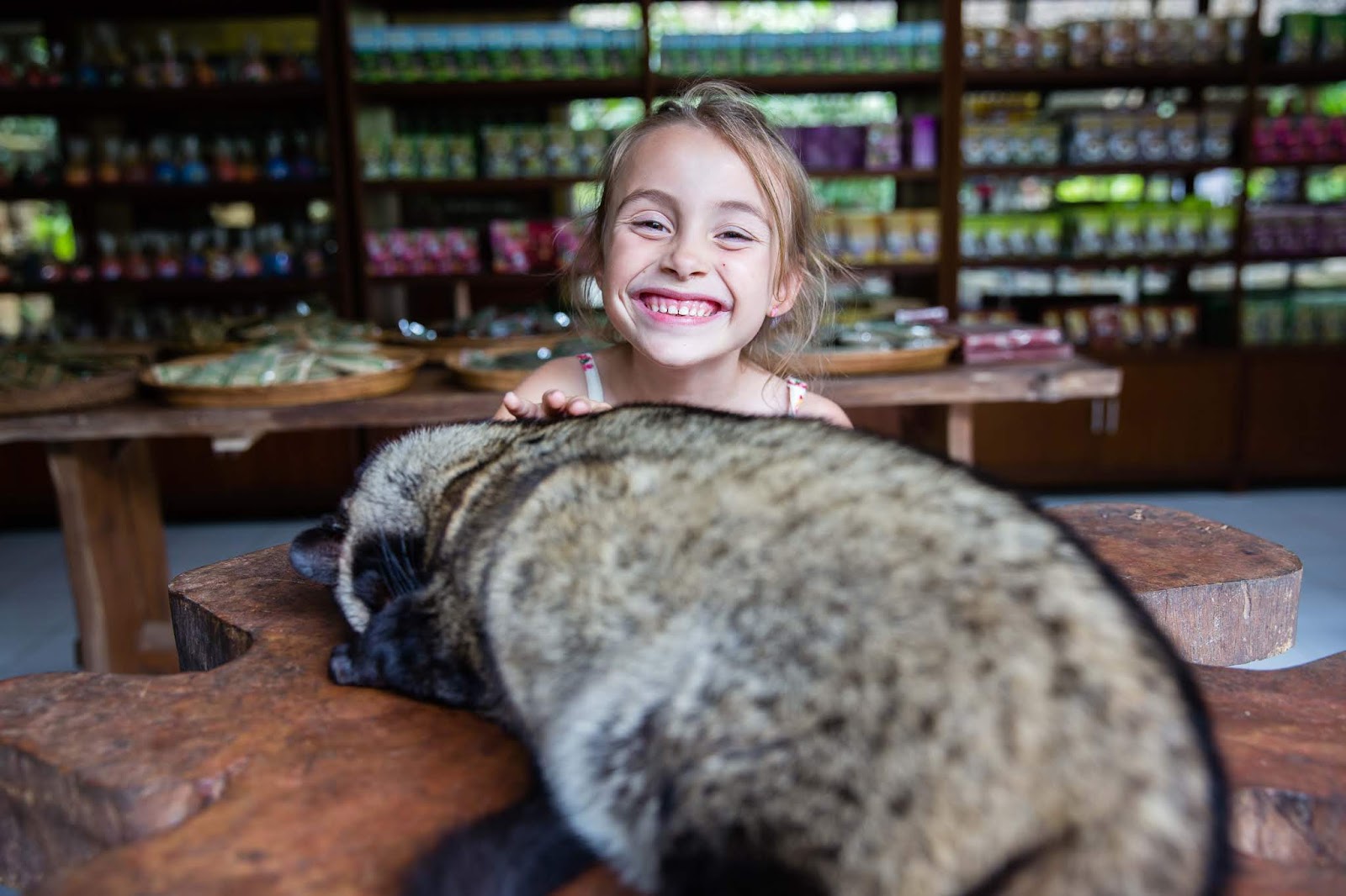 J'ai testé pour vous : verdict c'est assez parfumé, il y a des arômes de noisettes mais comme toutes les tasses de café que j'ai bu ici je n'ai pas trop aimé. C'est principalement leur façon de servir qui me gêne, ils laissent tout le marc du café au fond, résultat quand on boit on a la poudre qui reste collé dans la bouche et personnellement j'aime pas ça. Mathilde en train de caresser une mangouste: