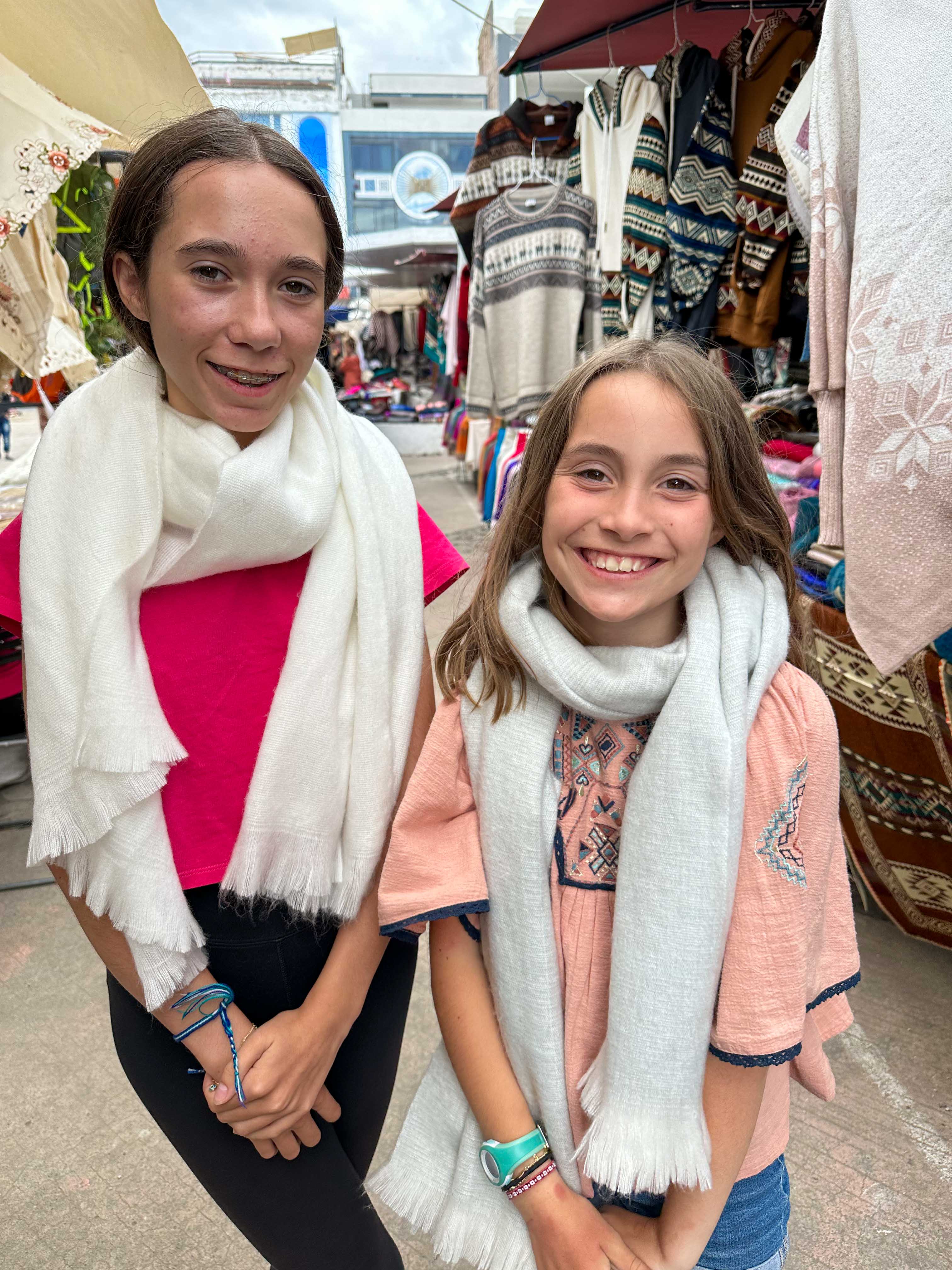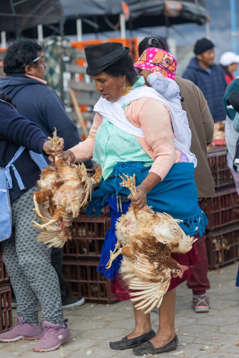 Nous allons ensuite au marché de l’artisanat. Par rapport à la veille où seule la place des ponchos était occupée, cette fois le marché commence au pied de notre hôtel. Les rues sont envahies d’étals et de marchands.