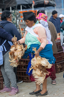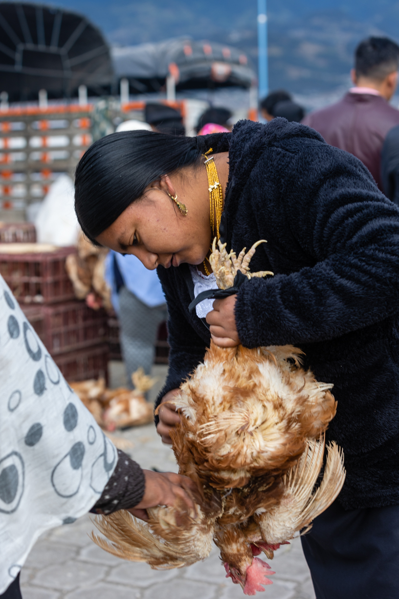 Il y a beaucoup de vendeurs de volailles. Les poules vivantes sont ligotées et changent de main contre un billet.