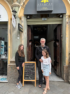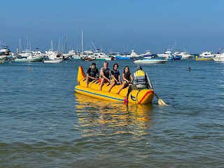 Les filles insistent pour monter sur un bateau « banane ». Il s’agit d’un cylindre gonflé traqué par un bâteau à moteur. On s’accroche au boudin par une lanière en tissu et c’est parti pour quelques minutes de sensations. Le bateau nous sort de la plage et une fois en mer s’emploie à nous faire chavirer. Nous sommes quatre Mathilde, Julie, moi et un équatorien. À la première tentative notre compagnon tombe à l’eau alors qu’on s’accroche et qu’on tient, mais sur le deuxième virage c’est la chute à l’eau.