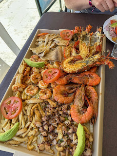 Pour le repas, on décide de partager entre Julie, Céline et moi un plat de poissons et fruits de mer. C’est annoncé pour deux, on va manger à 4 dessus finalement, et il va en rester un bon quart. À Chaque fois on se fait avoir sur les proportions qui sont vraiment XXXL ici.